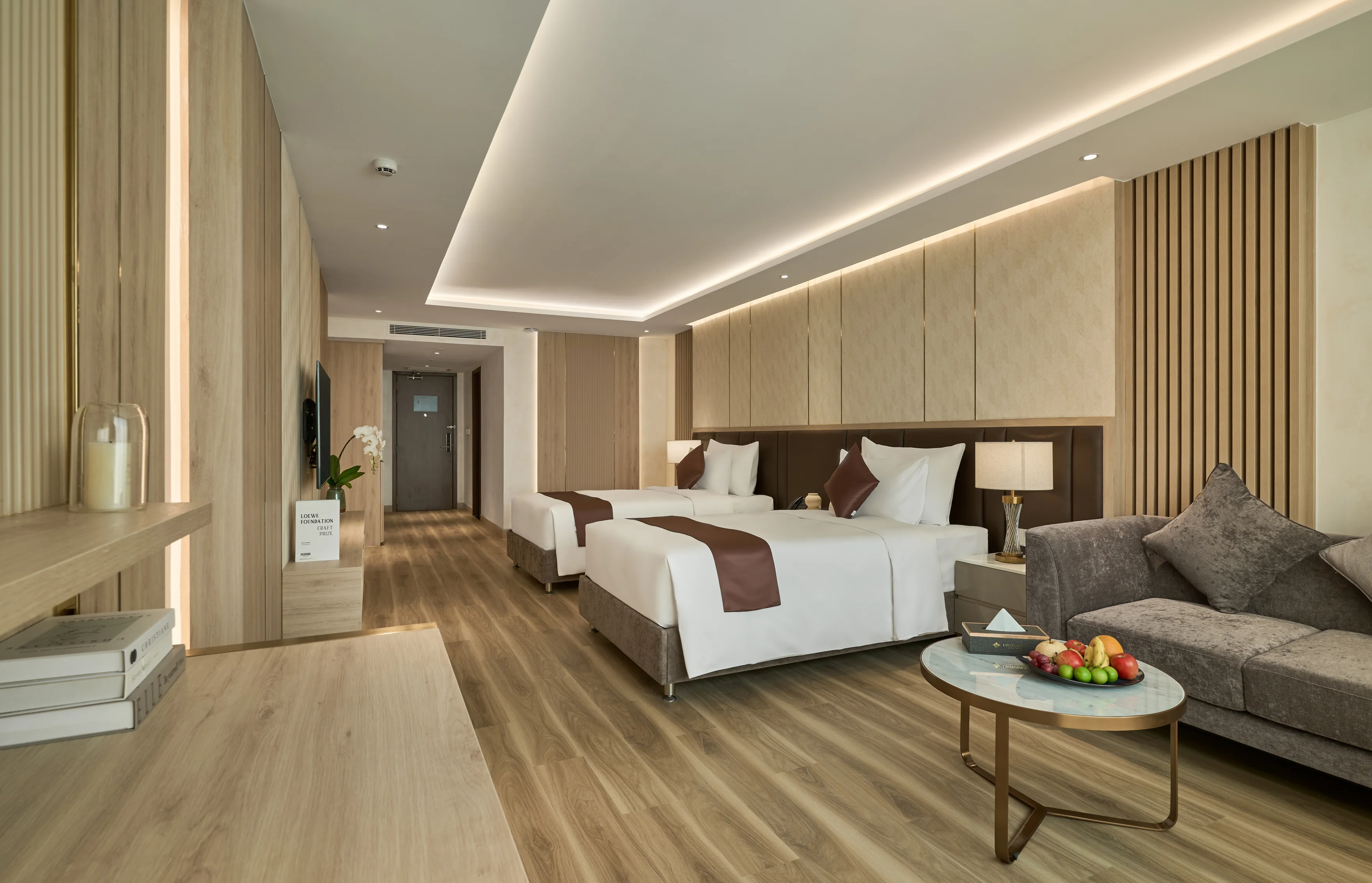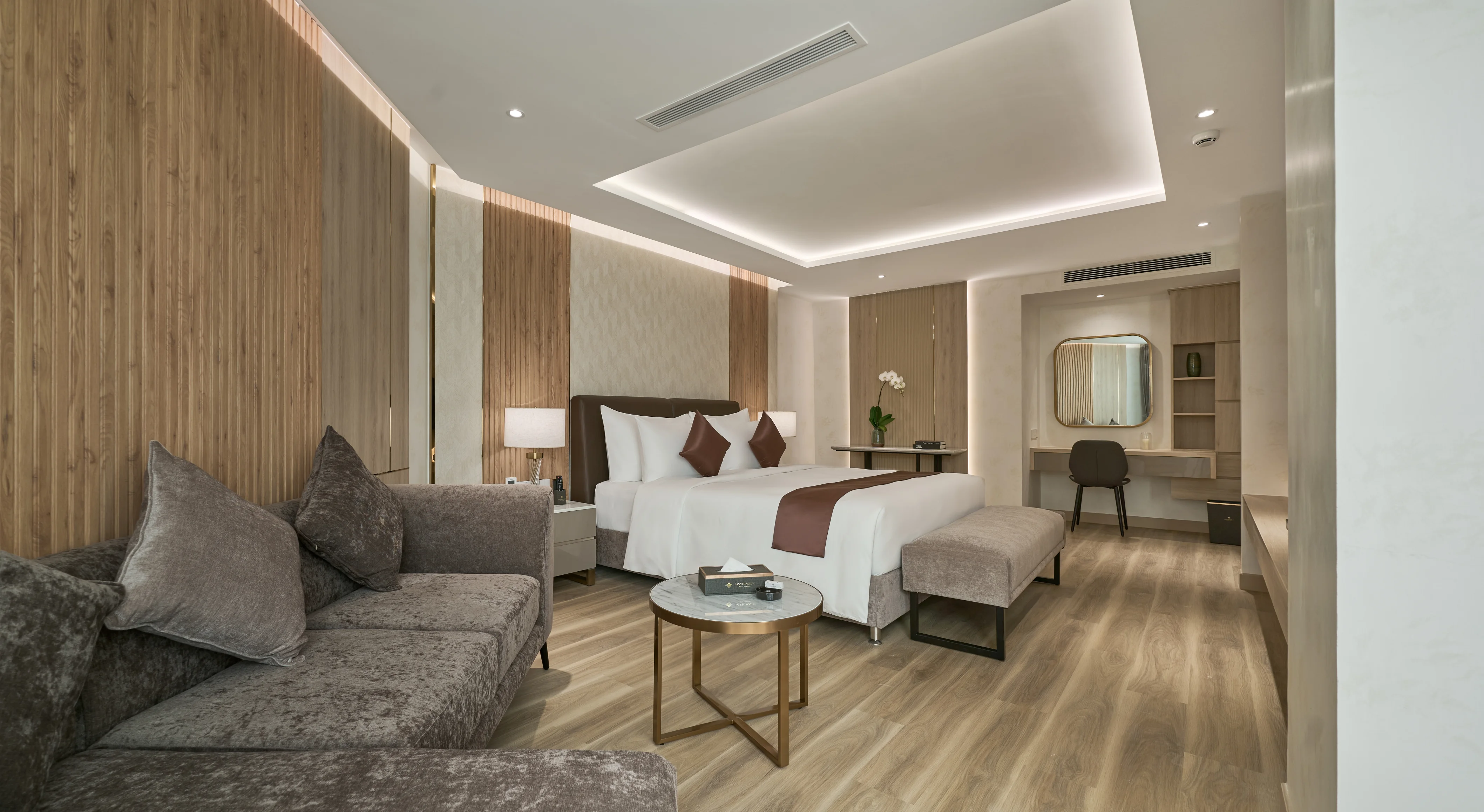 Experience the ultimate in luxury with our Superior Suite room. The room boasts a spacious, separate living room that is meticulously decorated and elegantly arranged with sophisticated interior design that imbues the spirit of Indochina. The space is thoughtfully designed for maximum convenience and prioritizes visual effects from the materials used while welcoming natural light to breathe life into the space.